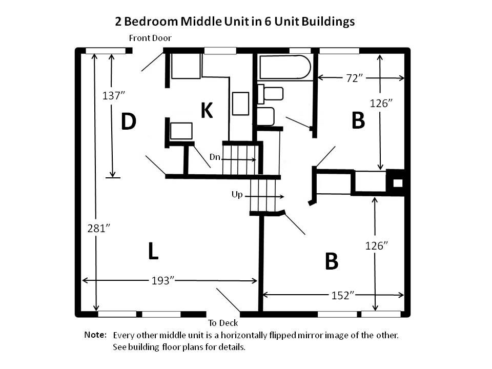 2 bedroom middle unit in 6 unit buildings