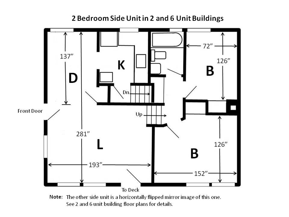2 bedroom side unit in 2 & 6 unit buildings